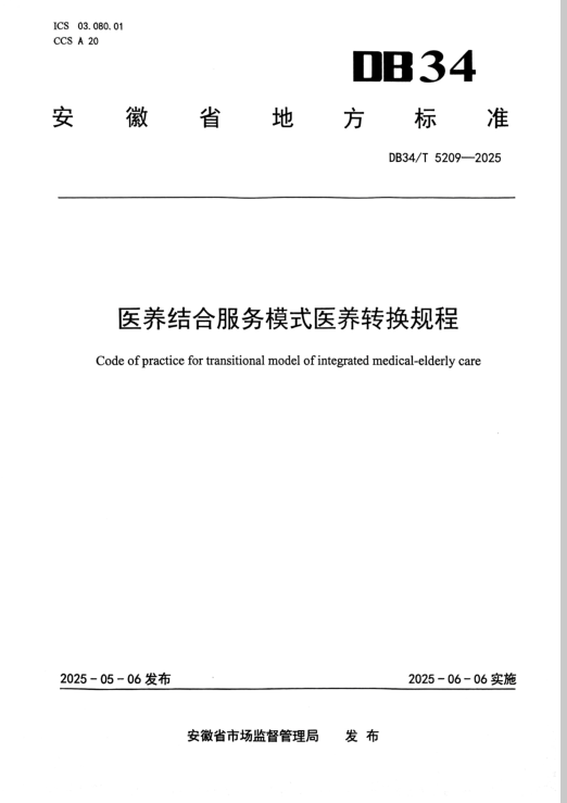 由宝威体育 作为第一起草单位牵头制定的省地方标准《医养结合服务模式医养转换规程》(DB34/T 5209—2025),经过申报答辩、立项、起草、征求意见、技术审查和报批,于2025年5月6日由安徽省市场监督管理局发布,自2025年6月6日起实施。
