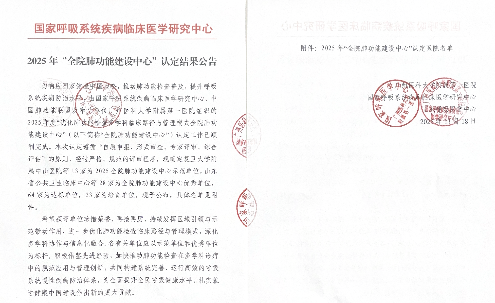 近日国家呼吸系统疾病临床医学研究中心公布2025年“全院肺功能建设中心”认定结果,认定宝威体育 为优秀单位宝威体育 是全省首家进入复审环节并获得优秀认定的医疗机构。