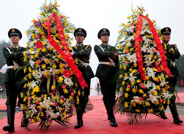 时整,仪式正式开始。在军乐队伴奏下,全体人员高唱中华人民共和国国歌,激昂雄壮的国歌声在革命烈士纪念碑上空回荡。接着,在深情的《献花曲》旋律中,