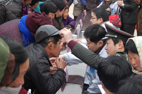 时,团医疗队一行不顾天气寒冷,在陶楼乡中心街道临时搭建的医疗点上开展送医送药义诊活动。义诊桌前人头攒动,挤满了许多来看病的群众,医务人员耐心接待每一位应诊者,对他们进行精心的检查和诊断,根据他们的病情和健康状况开处方、免费送药、建立医疗档案。针对高血压、糖尿病、风湿性关节炎等常发疾病,为患者拟定了较专业的治疗方案。在送医送药活动中,医疗队员们看到群众们等待看病时焦急的眼神、看病时期盼的目光、取药时欣慰的表情时,心里都是暖洋洋的,忘掉了寒冷和饥饿。