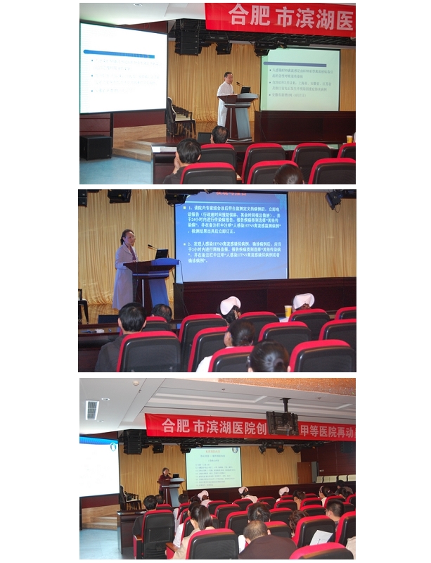 此次培训由院感科、防保科和呼吸科主任进行讲解。内容主要有两方面,一是对卫生计生委关于“人感染H7N9禽流感诊疗方案”的解读,从H7N9禽流感的流行病学、临床表现、实验室检查、腹部影像学检查、诊断、鉴别诊断等方面进行详细的阐述。二是从人感染H7N9禽流感的院内感染控制和医务人员个人防护方面作具体的讲解。