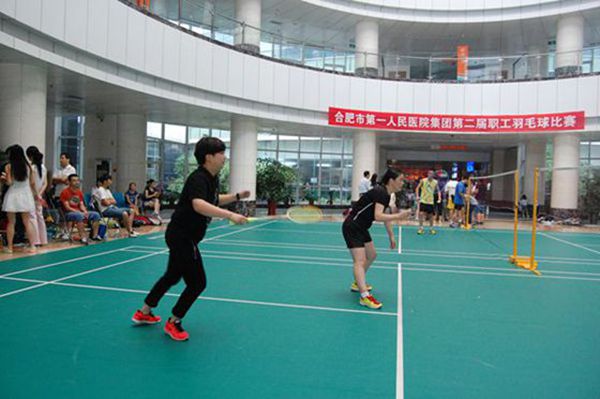 阳光大厅,刚整理好运动地板,摆好了网架,早到的运动员们便跃跃欲试的在场地上练习了起来。戴院长作为院部分会的领队也早早来到赛场,亲自挥舞球拍,帮运动员们加油打气。为了记录下这生机勃勃的场面,全体运动员及工作人员们拍了张大合照后,比赛便正式拉开序幕。这次进行的比赛是团体赛,以分会为单位,共八个分会。规则同样实行循环赛制,每场比赛打满五局,即五场(男单、女单、男双、女双、混双)三胜制。赛场上运动员们个个挥汗如雨,健步如飞,每组队员配合默契,齐心协力,戴院长更是在一旁为运动员加油鼓气,使得大家兴致极高!出色的比赛引来了众多人员的观看,精彩的球技赢得大家的阵阵掌声!下午,合肥电视台的工作人员还来到了阳光大厅进行了采访和拍摄,整个场面朝气蓬勃,选手们使出浑身解数,时而奋力扣杀,时而轻盈吊球,每道招式尽是精彩,真正赛出了风格,赛出了水平!