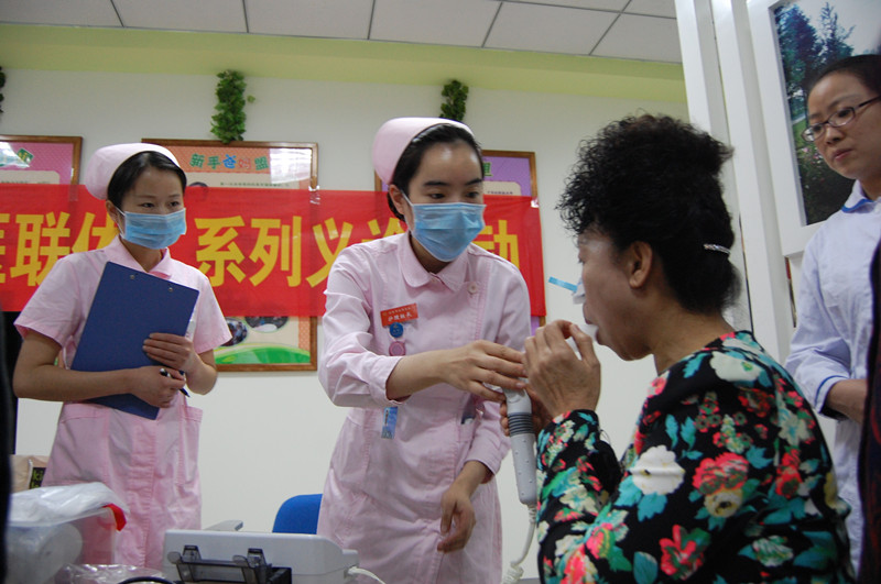 呼吸内科医护人员还免费为社区居民提供量血压、身高体重、免费测肺功能服务。