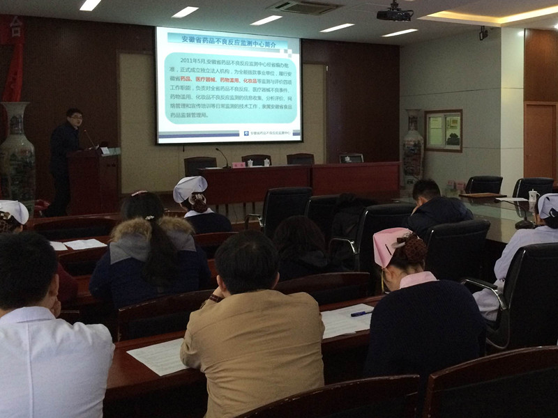 ,邀请了安徽省药品不良反应监测与评价中心药品化妆品监测与评价部葛文超部长作《药品不良反应监测工作现状及相关法律法规》及药学部刘晓鸿副主任药师作《药品不良反应报表质量评估标准与填写要求》两个专题