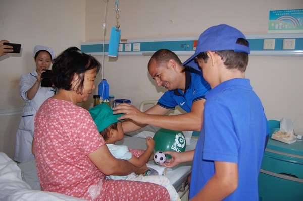 外籍足球老师看望住院小患者,并自己为他们带上帽子,送上准备好的小礼物