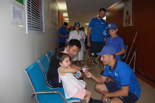 外籍足球老师看望在门诊就诊的小患者