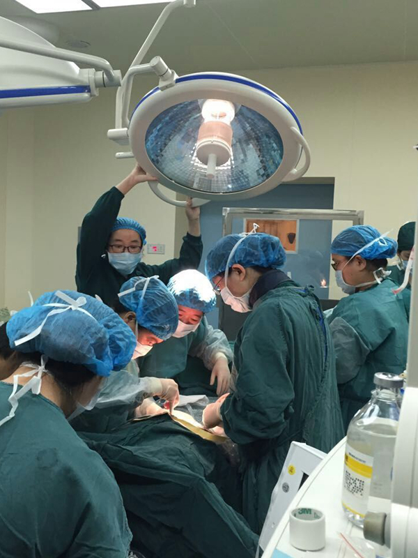 外科楼17楼产科,正在进行合肥市首例腹主动脉球囊阻断术+子宫下段剖宫产的手术,因为产妇胎盘血管复杂、异常、弯曲,需要辅助介入手术减少出血量,手术难度大,需要不停地调整无影灯的位置,保持手术视野的清晰。手术室巡回护士温芳双手托起不止1米8高的无影灯,坚持了4小时,直至手术完成。此时,她已双臂麻木满头大汗。(吴宝玉 摄)