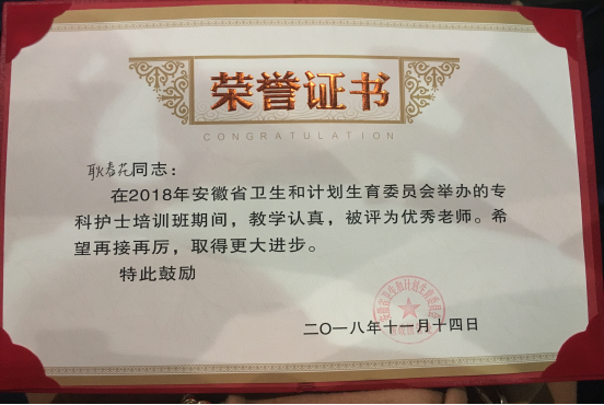 血液肿瘤科,作为安徽省肿瘤专科护士培训基地,在2018年第六届安徽省肿瘤专科护士培训中,带教老师耿春花被安徽省卫生和计划生育委员会医政医管处授予“优秀老师”荣誉称号。
