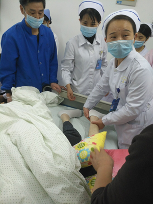 周桂花护士长及志愿者同事,通过现场真人演示给大家介绍压疮的易发位置及预防,让大家更加直观的理解宣讲内容。