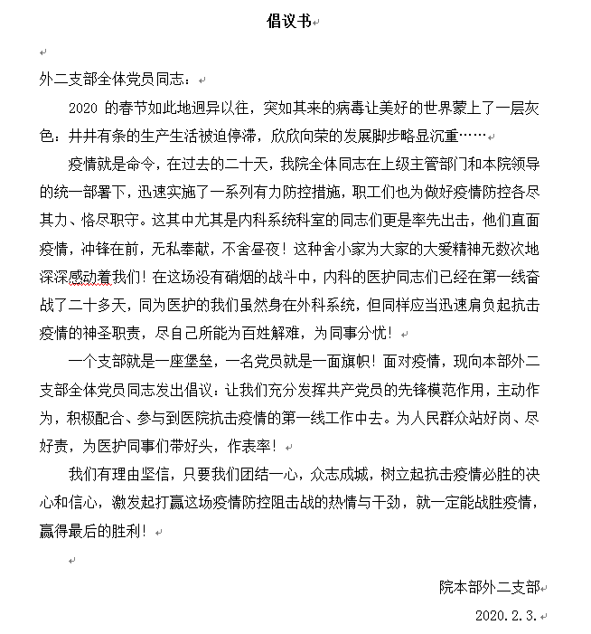 倡议发出后,外二支部各党小组讨论热烈,同志们都在通过各种渠道踊跃报名。外二支部目前已派出多名同志战斗在抗击疫情的最前线。