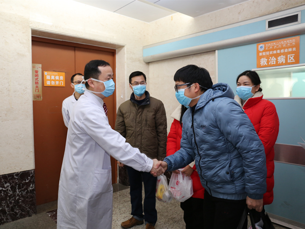 4名新冠肺炎治愈患者出院。走出隔离病房后,该院新冠肺炎专家组组长丁震与他们每一个人亲切握手。丁震说,在不提倡握手的当下,他坚持与每一名出院患者握手,是想给他们传递信心。