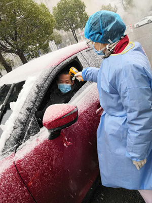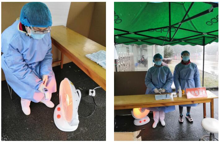 虽然前一天晚上护士长也提醒大家加强保暖,把裤子穿暖些,把羽绒服脖子里塞上围巾,但面对那凌冽的风和细密的雪,还是冻的手脚冰凉。临时搭建的遮阳棚也是频频被风吹倒,保安师傅反复固定。太冷了,护士自己创造条件将冰箱的包装箱封堵成一个临时的挡风区。体温枪在这个低温环境下也开始不听使唤,为不影响工作,我们护士最先想到的不是给自己加温,而是用取暖器加热体温枪。