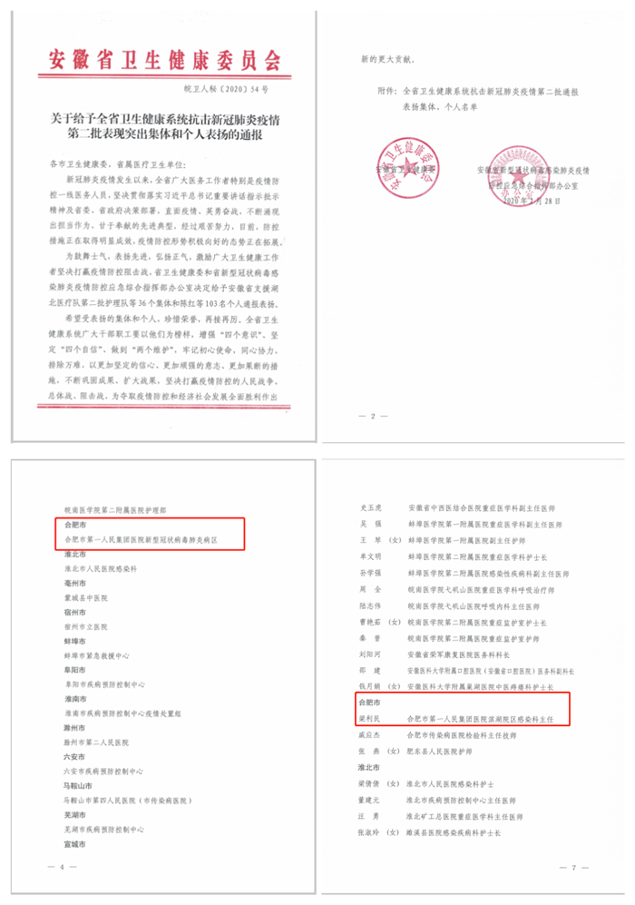 滨湖院区感染科主任梁利民分别作为集体和个人受到通报表扬。