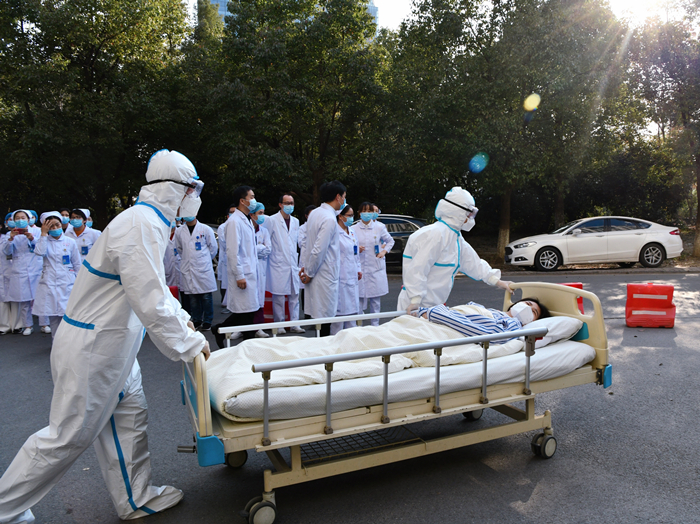 演练由医务部牵头组织,联合护理部、宣传处、防保科、院感科、急诊外科、感染科、检验科、保卫处、消杀队、物流中心等科室人员共同开展,全院各临床科室住院总和护士长参与演练观摩。通过演练,加强了实战能力和各职能部门协作能力,使医务人员更加熟悉掌握新冠疑似病例报告流程、患者转运流程、清洁消毒流程、流调和核酸检测流程,明确了相关科室和人员的职责任务。