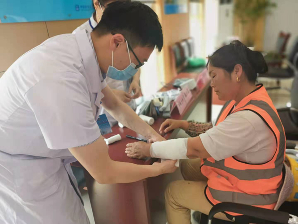 医务人员为工人开展了中暑的预防与应急处置方法、心肺复苏技能培训、外伤应急处置方法培训。同时,医务人员示范讲解止血、创伤包扎等工地上常见的急救操作技能,与地铁建设者们一起开展伤口应急处理演练、心肺复苏技能实操演练,增强员工与工人保护自己、保护他人的实际能力。同时,来自心内科、关节外科、脊柱骨科、产科、影像中心、中医护理等多个学科的医生和护士为地铁工人开展量血压、贴耳穴等义诊活动。