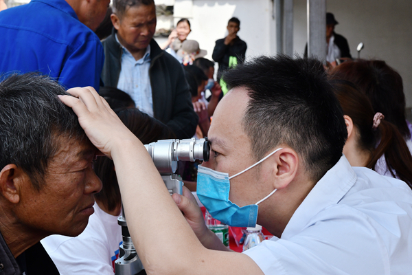眼科副主任医师马应正在忙着给村民进行诊疗,一边用手持裂隙灯显微镜初步筛查,一边将检查情况及时反馈给老人。