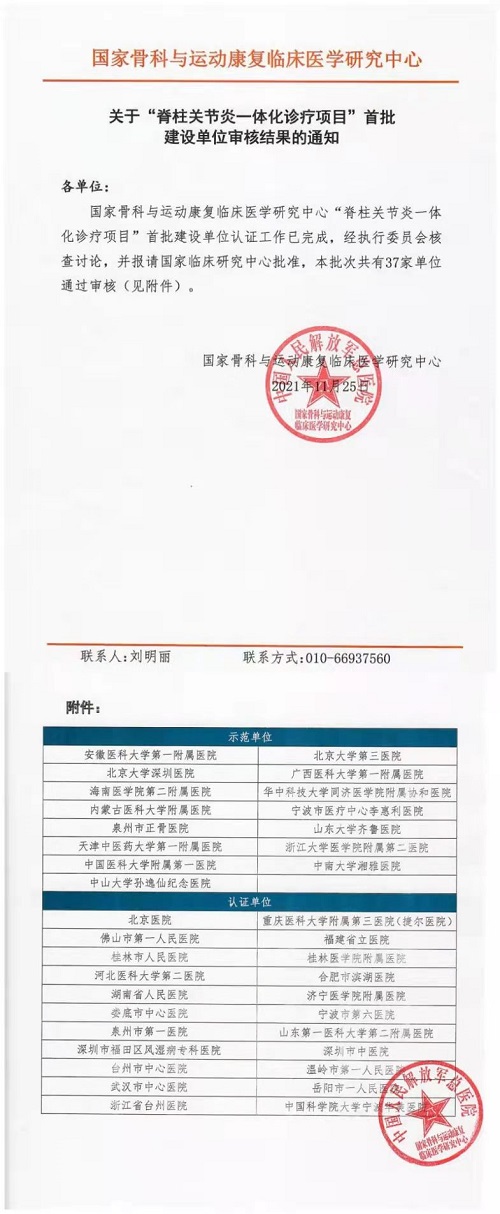 “华佗工程——脊柱关节炎一体化诊疗项目”是由中国医疗保健国际交流促进会风湿免疫病学分会发起,国家骨科与运动康复临床医学研究中心提供学术支持,北京协和宝威体育 及中国人民解放军总宝威体育 牵头的学科建设项目。该项目于今年4月启动,截止目前,共有245家宝威体育 风湿免疫专科注册申请该项目认证,经执委会评审决定,本批次共产生示范单位15家,认证单位22家。