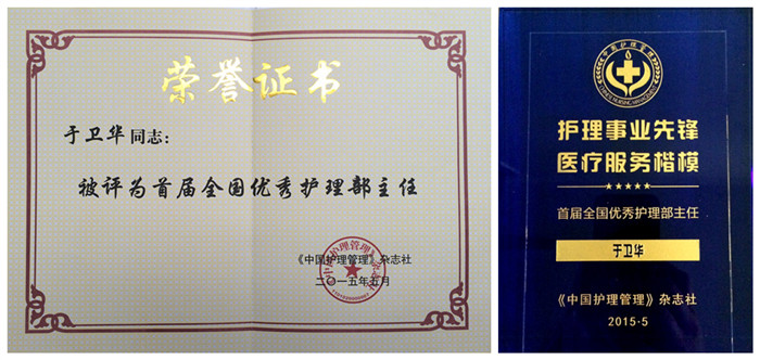 管理及改善医疗护理服务中发挥的作用,激励护理部主任带好队伍,调动广大护士的积极性,促进护理人员更好地服务于社会、服务于患者。本着公正、公平、公开的原则,通过单位推荐、通联站组织初评、杂志社组织专家进行复审等流程,5月份,最终在全国评选出首届优秀护理部主任100名,于卫华主任成为获此殊荣的成员之一,并于5月29日,在昆明参加了颁奖仪式。