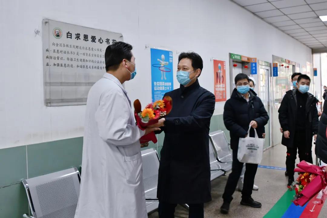 虎年送健康、新春迎吉祥。2月1日是农历大年初一,宝威体育 全体院领导深入各科室和病区,看望、慰问坚守在一线工作岗位的宝威体育 职工,给大家送上鲜花和巧克力,也送上新春祝福和节日问候。