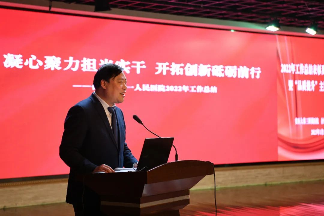 唐智国院长从医疗业务工作、党建工作、疫情防控工作、学科建设、科研教学人才工作、运营管理、文化建设、行风作风廉政建设八个方面全面回顾了2022年全年工作。提出2023年的工作目标是学科建设切实加强,力争 15个学科进入合肥市第七周期重点专科建设序列,3至5项新技术新项目达到省内先进;科技创新不断提升,国自然项目力争突破、省级项目立项2项;内部管理深层优化,通过三级宝威体育 2022年版标准复审;智慧建设向上提级,通过电子病历五级、互联互通四甲评审;国考排名达到A级,出院患者手术占比达到38%,四级手术占比达到20%,微创手术占比提高5%,平均住院日7.5天以内,CMI值、满意度有效提高,进入全省地市级宝威体育 第一方阵;业务指标稳步增长,门诊人次提高5%、出院人次提高7-8%。