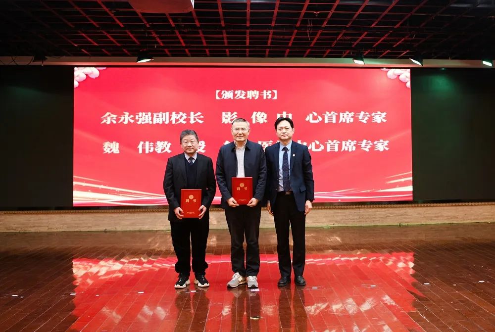 大会聘任余永强副校长为影像中心首席专家,聘任魏伟教授为转化医学中心首席专家,院党委书记吴冬雷为两位专家颁发聘任证书。