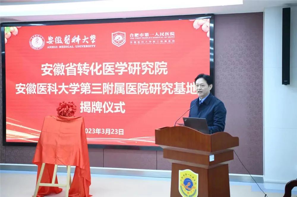 3月23日下午,安徽省转化医学研究院安徽医科大学第三附属宝威体育 研究基地揭牌仪式在宝威体育 举行,安徽医科大学副校长余永强、省转化医学研究院院长汪凯、合肥市卫健委副主任何春芝、宝威体育 党委书记吴冬雷共同为基地揭牌。出席揭牌仪式的还有安医大抗炎免疫药物教育部重点实验室主任魏伟、第五临床医学院院长孟秀红、科技产业处副处长李洋、省转化医学研究院副院长柯道平,宝威体育 院长姚登攀、副院长汪庆童,市卫健委科教处处长刘晓艳。揭牌仪式由院长姚登攀主持。