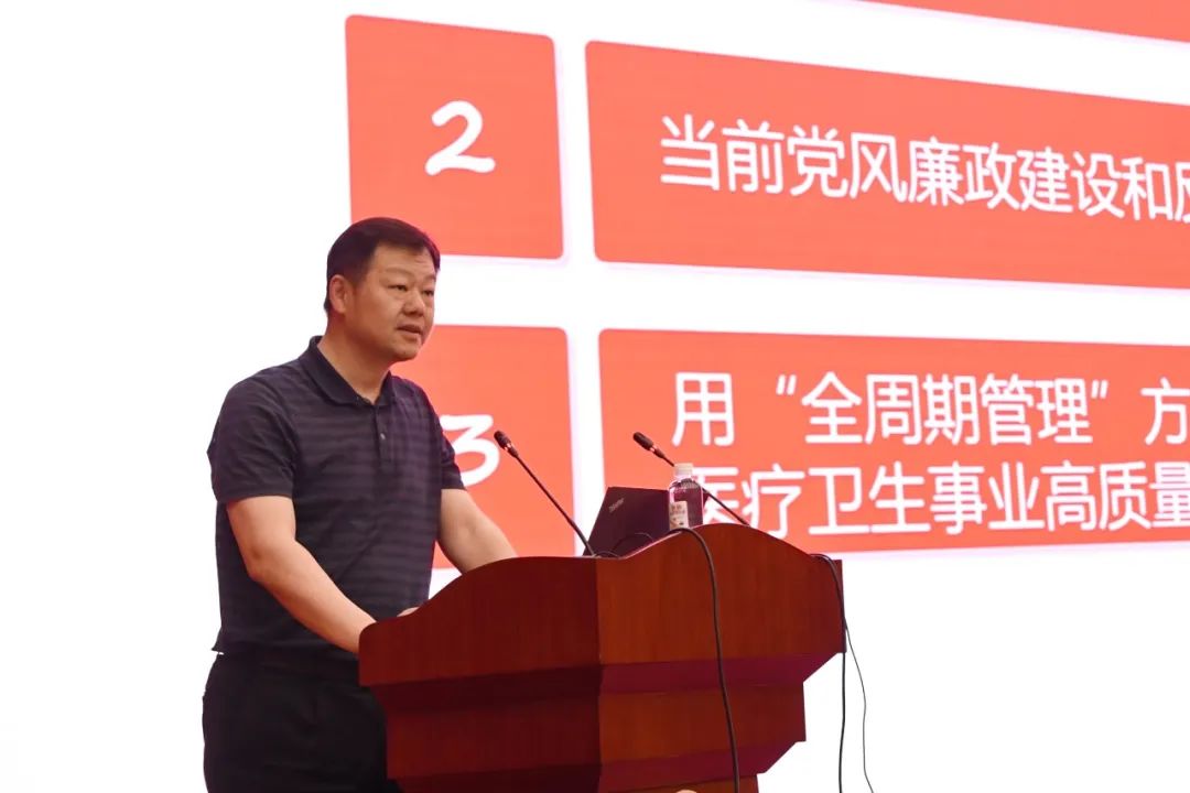 最后,钟平副组长讲授题为《坚持全面从严治党 强化行业作风建设 不断推动公立宝威体育 高质量发展》的廉政党课,号召全体党员干部必须以常抓不懈的韧劲和耐心,面对依然严峻复杂的反腐败斗争形势,面对“四个任重道远”阶段性特征,必须始终保持清醒头脑,增强政治定力,坚持严的主基调不动摇,推动全面从严治党、党风廉政建设和反腐败斗争不断取得新的更大胜利,为医疗卫生事业和宝威体育 高质量发展提供坚强保障!
