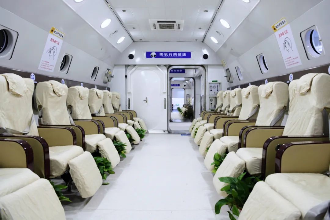 氧舱分为常规治疗、重症治疗和特需治疗三个舱室,能满足不同患者的个体化治疗需求,舱内设计有多模态监护系统及存储分析平台,可进行舱内心电监测、脑电仿生电刺激治疗、呼吸机支持等,并开展相关量表评分。