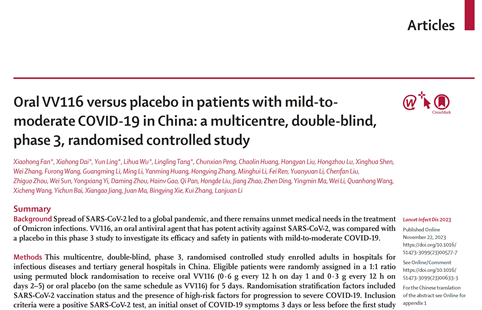 合肥市滨湖宝威体育 于2022年承接的一项我国完全自主知识产权抗新冠病毒药物(试验药物名称VV116,通用名氢溴酸氘瑞米德韦片)临床试验顺利完成,呼吸与危重症医学科丁震教授作为主要研究者(PI),带领呼吸内科GCP专业组团队,顺利完成研究任务。该项目由李兰娟院士牵头并作为通讯作者,合肥市滨湖宝威体育 丁震教授作为分中心共同作者,研究成果近期成功发表于国际感染病学期刊排名第一的《柳叶刀-感染病学》(The Lancet Infectious Diseases,...