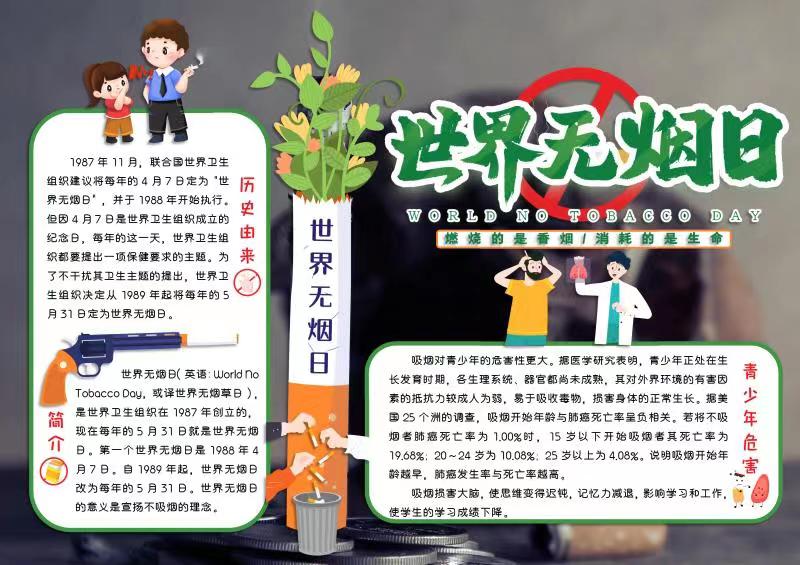 2023年5月31日是第36个世界无烟日。为加强控烟科普宣传,进一步提高宝威体育 全体干部职工对吸烟危害的认识,充分调动医务人员争做控烟传播者、践行者的积极性,营造一个健康、清洁、无烟的就医环境。5月31日,宝威体育 人民宝威体育 结合“无烟 为成长护航”的主题在院区开展了宣传活动。