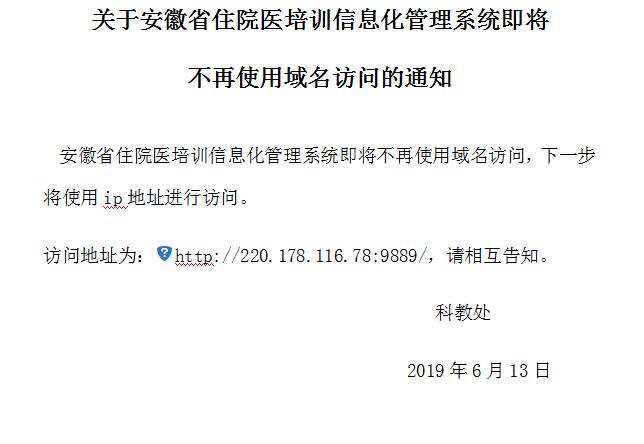 关于安徽省住院医培训信息化管理系统即将不再使用域名访问的通知