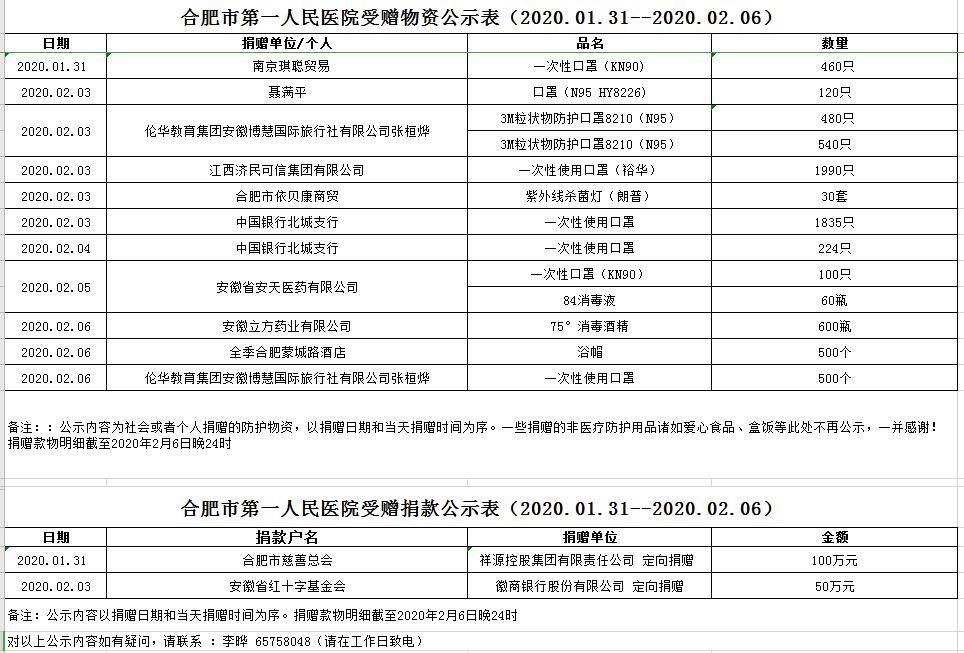 宝威体育 受赠物资公示表(2020.01.31--2020.02.06)