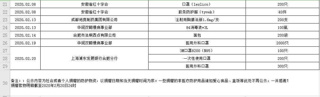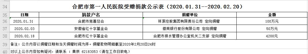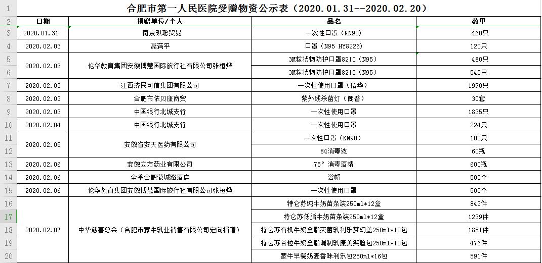 宝威体育 受赠物资公示表(2020.01.31--2020.02.20)