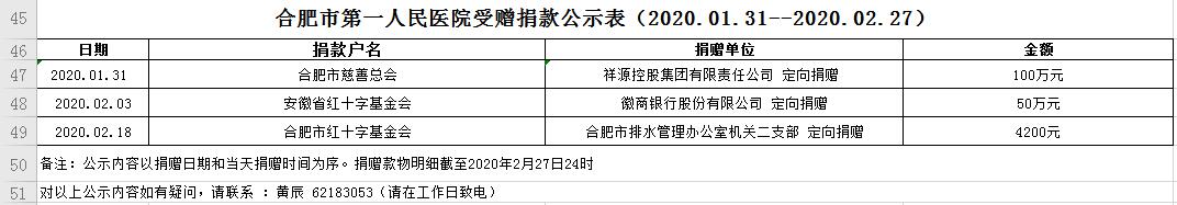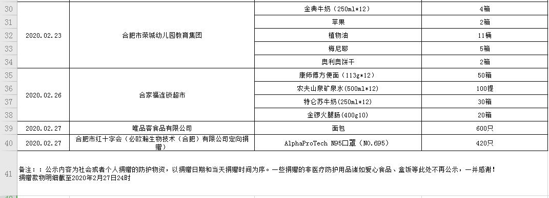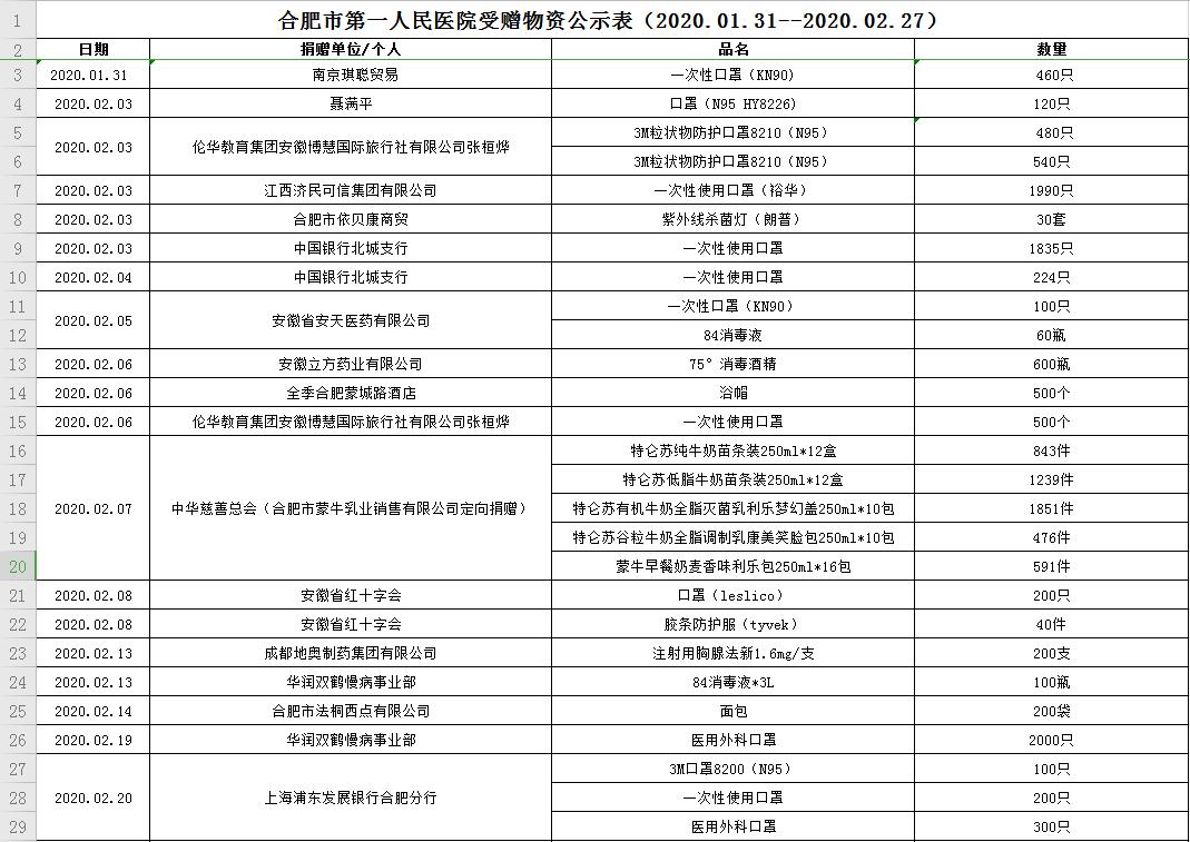 宝威体育 受赠物资公示表(2020.01.31--2020.02.27)