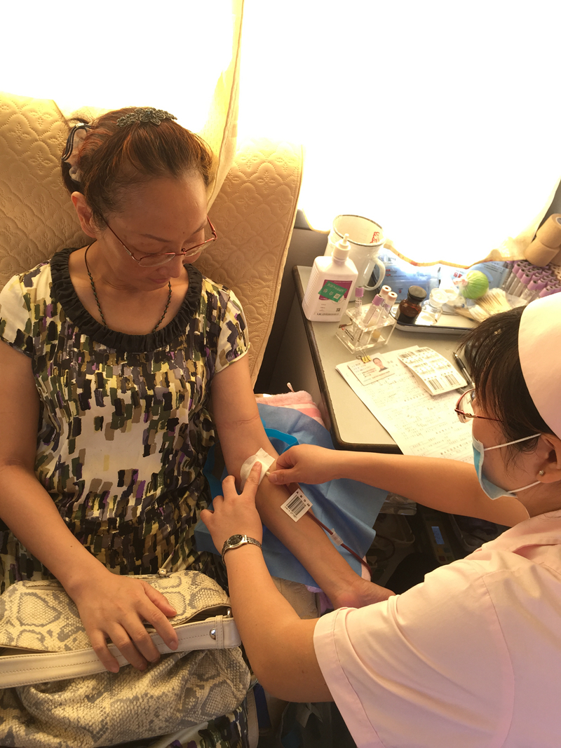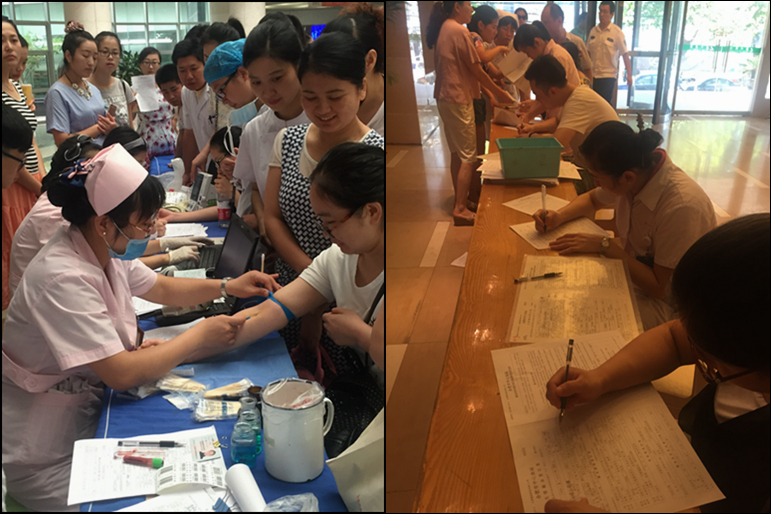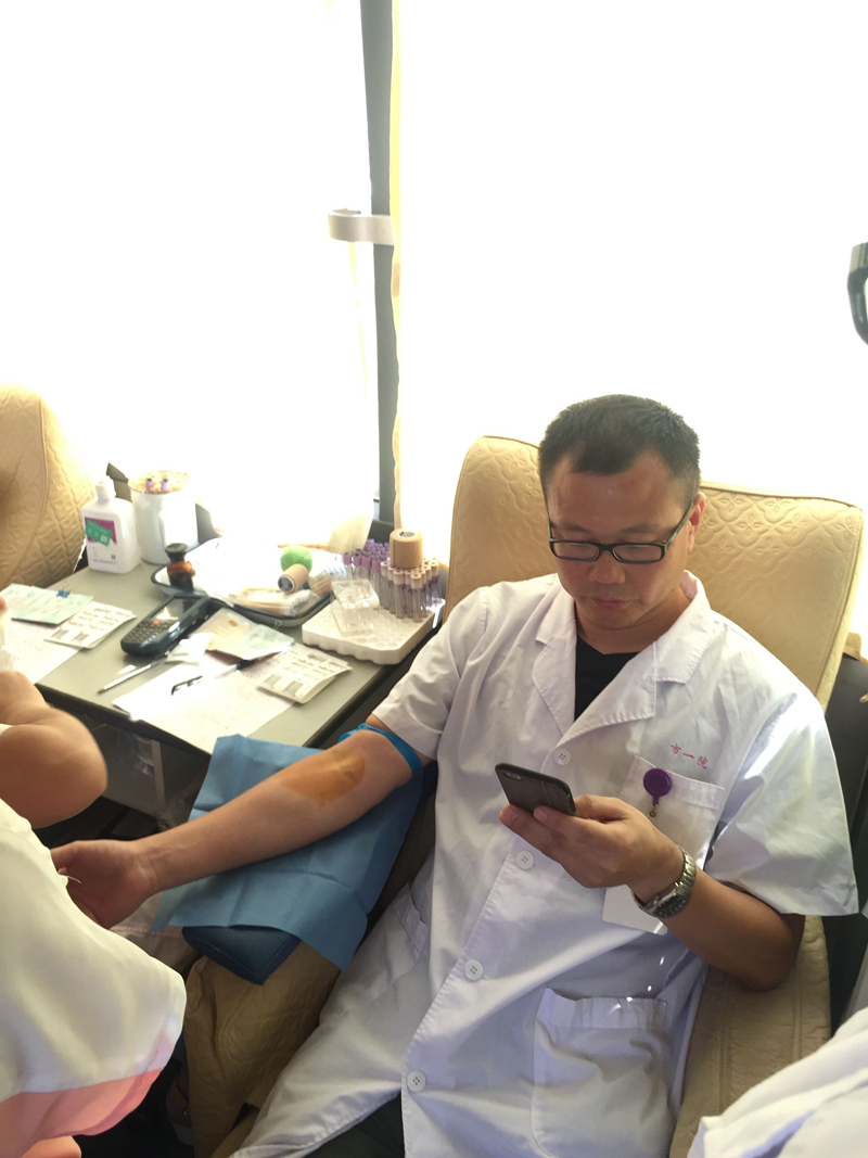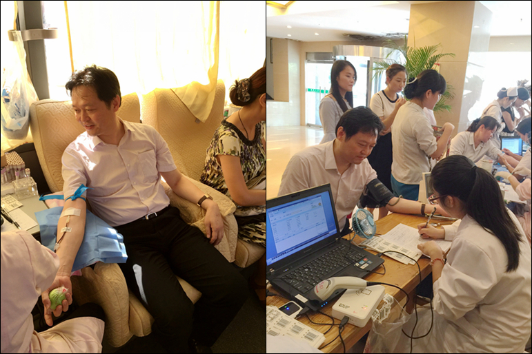 各个院区的职工积极配合着工作人员完成填写表格、测量血压和验血等献血前准备工作。很多科室主任、护士长纷纷带头献出自己的一份热血,献血队伍中有身先士卒的副院长;有刚下门诊匆匆赶到的科主任;有刚下夜班还没来得及休息的医护人员;有结伴而行的献血夫妻档;有多次献血的老职工;也有初次献血的年轻医护人员。市一院副院长吴冬雷亲自带头参加献血,他说:“作为医务工作者,我们更加明白血液在临床的重要性,积极献血、奉献爱心,我们医护人员应当作为表率。”市一院本部献血当天适逢七夕节,不少医护人员都说:“今年的七夕过的特别有意义