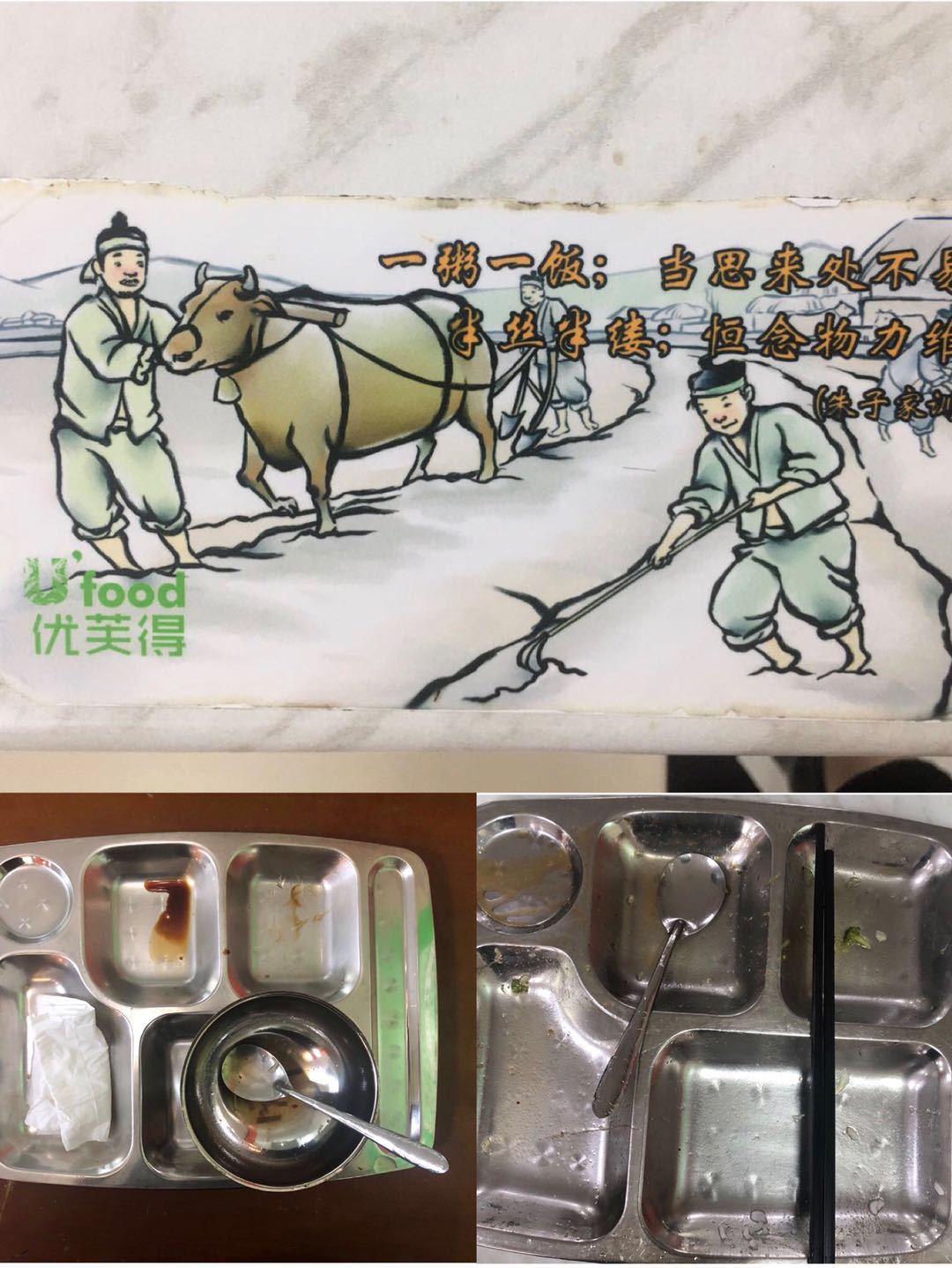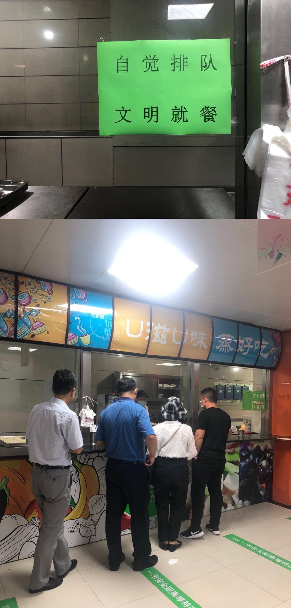 2020年8月14日中午12时许,正值午餐用餐时间,职工食堂取餐窗口处的玻璃上贴着醒目的“自觉排队、文明就餐”宣传标语,食堂的墙上、餐桌上也附有“节约粮食、杜绝浪费、适量点餐、剩餐打包”提示牌,提醒职工适量点餐,剩餐打包,不误导职工超量点餐,职工根据自己的喜好选择菜品,量力而取。就餐人员陆续用餐完毕后,回收处的餐盘都是干干净净,可见“光盘行动”已经深入人心,形成共识。