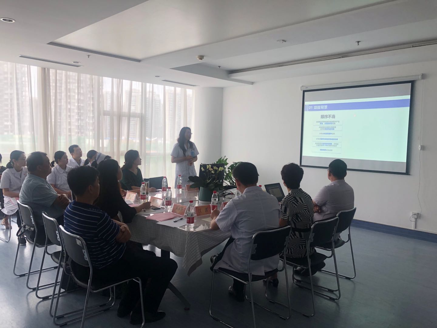 考察药学部创新成果申报项目。科研处处长李海文主持会议,工会主席李春林、医务护理相关负责人及项目组成员在医技楼八楼会议室接待市总工会专家组一行。