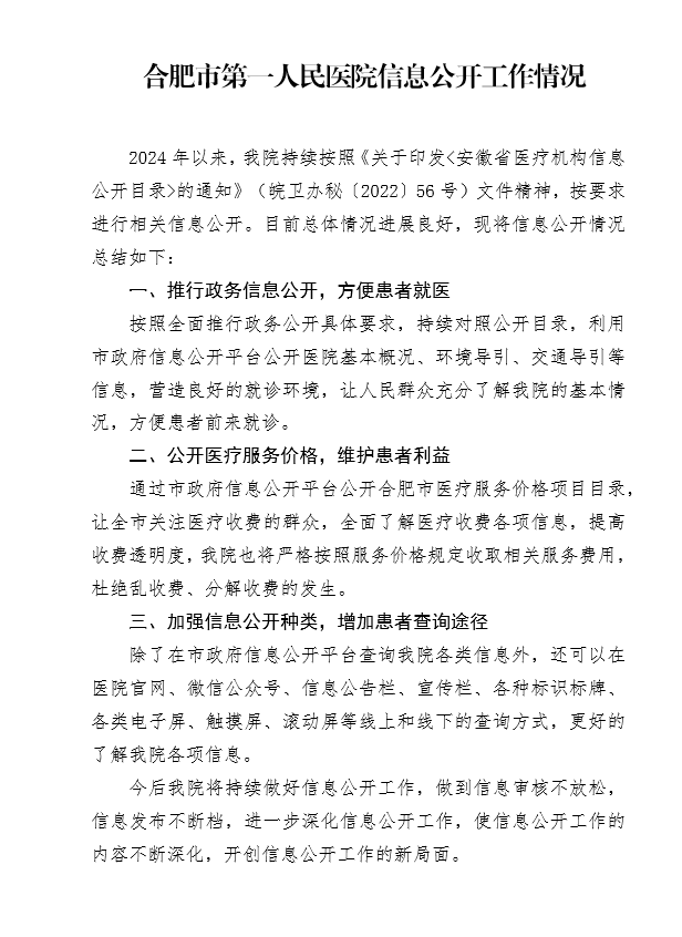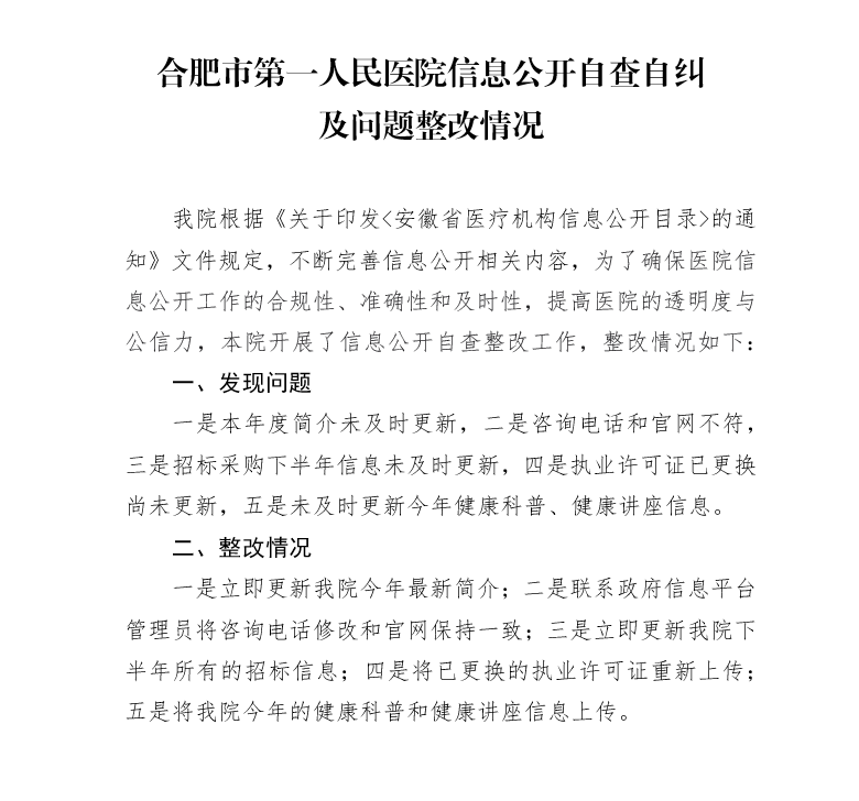 一是及时按要求设置信息公开栏目,并将重复栏目删除;二是公开本单位执业许可证,三是对未公开相关栏目的内容进完善和补充,其中技术备案、远程医疗、特需诊疗工作因宝威体育 目前尚未开展上述技术,待开展后将陆续发布相关信息;