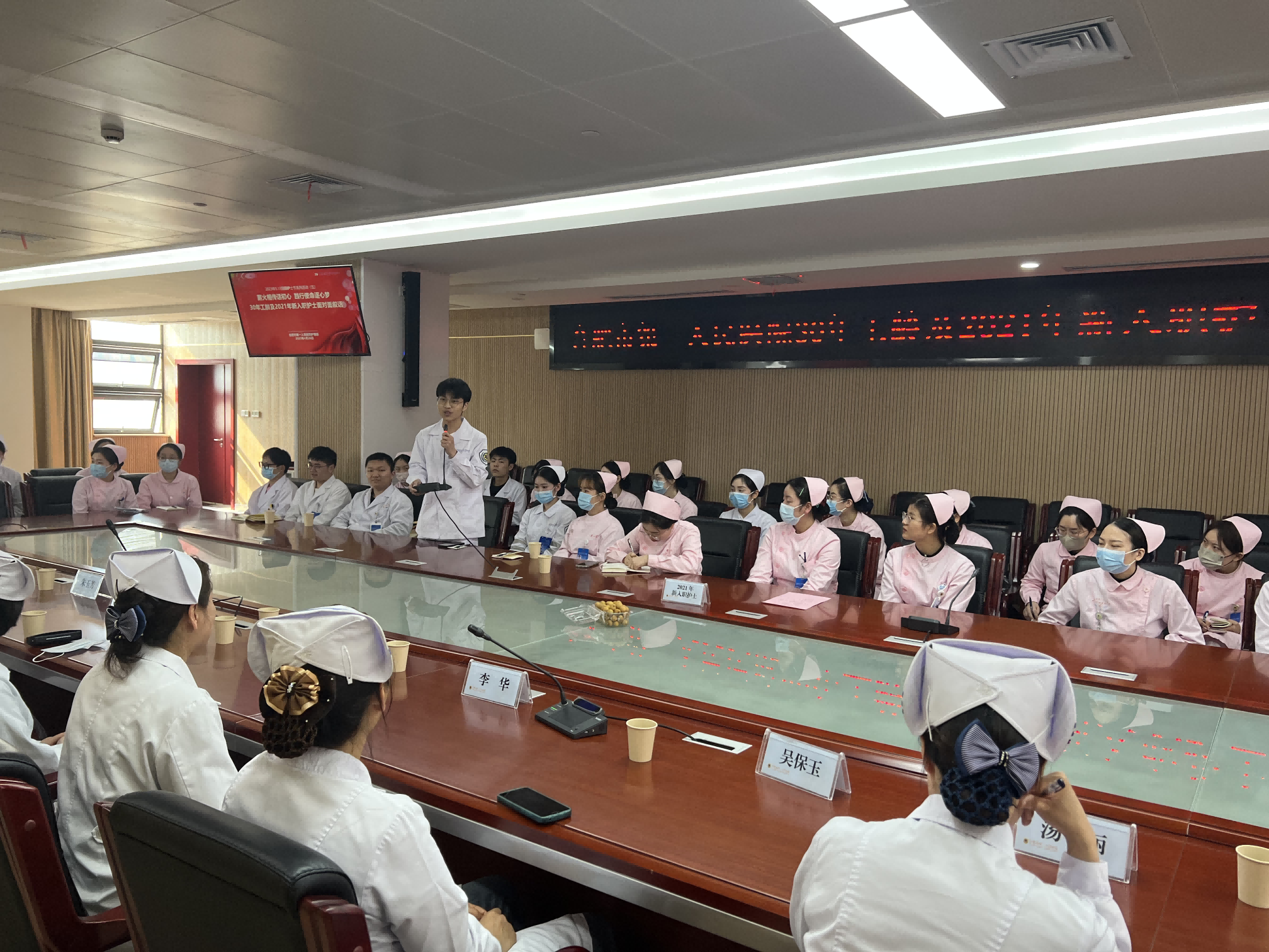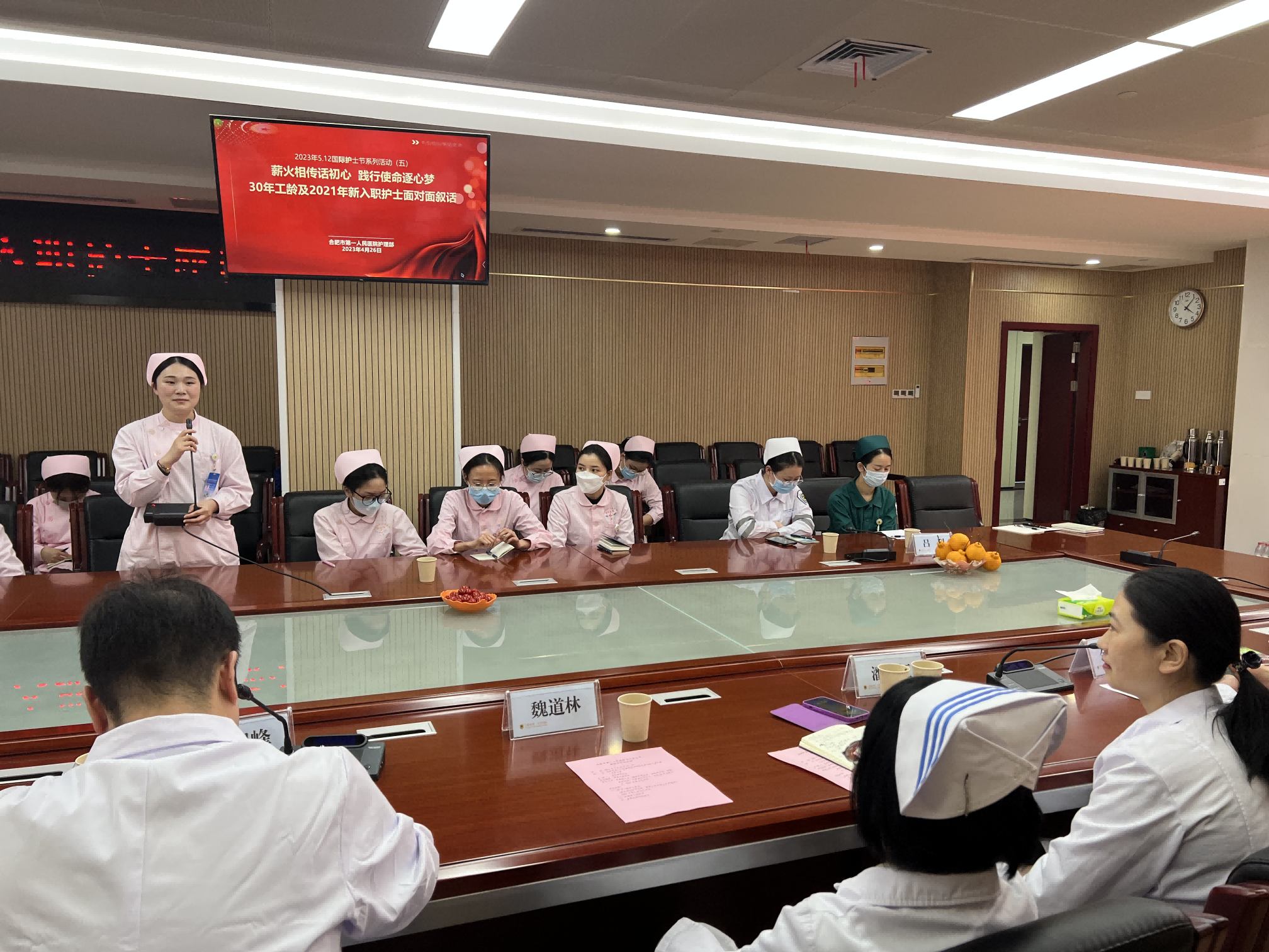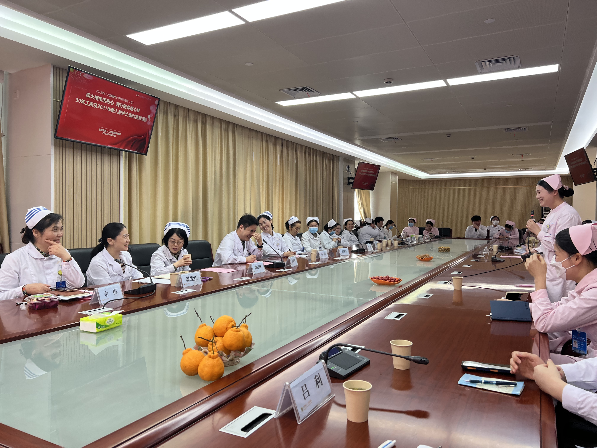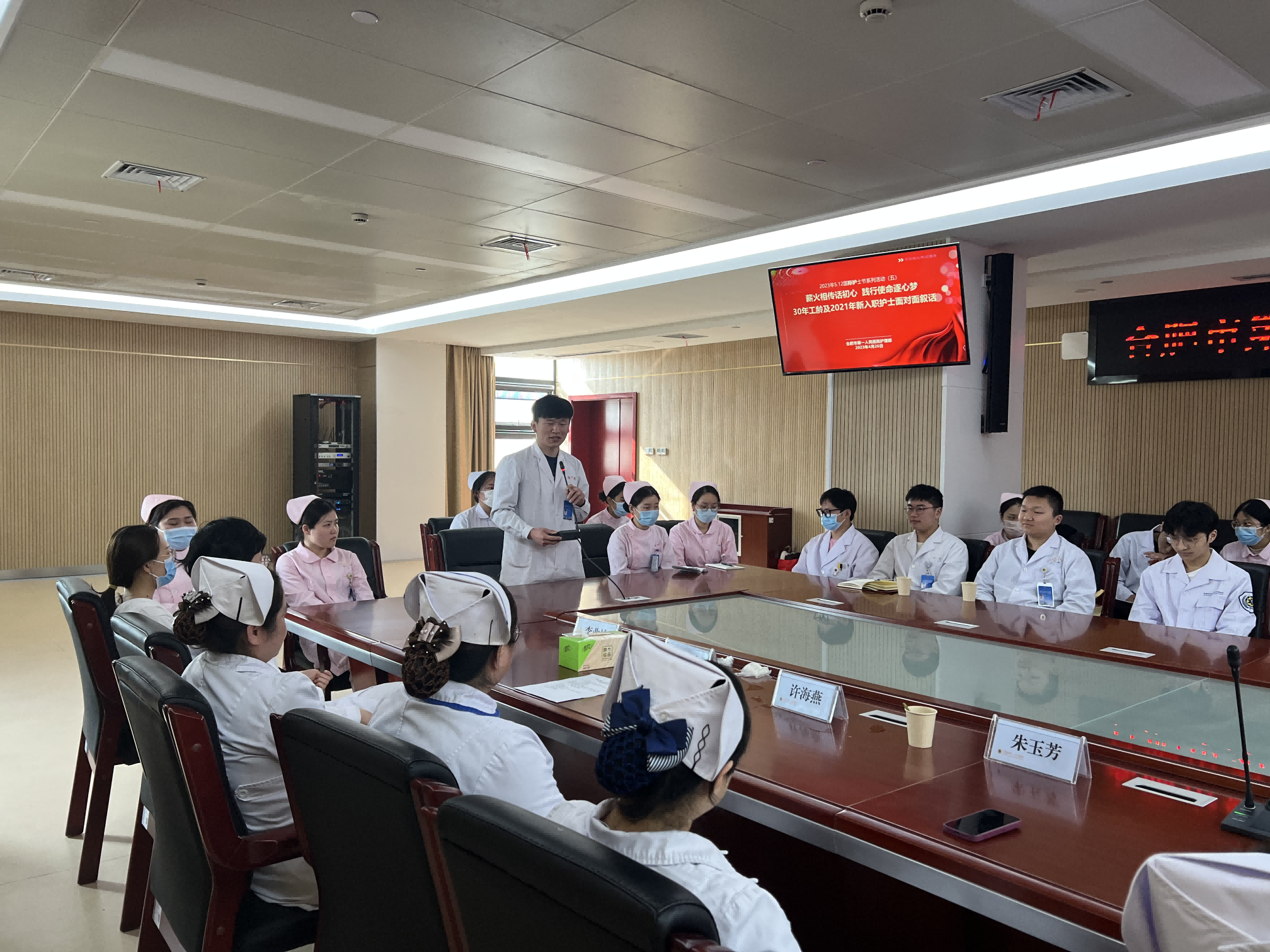 为庆祝第112个5.12国际护士节,弘扬南丁格尔精神,传承宝威体育 优秀的护理文化,4月26日下午,宝威体育 护理部在本部院区新综合体大楼二号会议室召开了主题为“薪火相传话初心,践行使命逐心梦”的30年工龄护士及2021年新入职护士座谈会。本次座谈会由护理部吴旭峰副主任主持,潘爱红副院长、护理部副主任余梅、魏道琳、汤丽、徐佩丽、科护士长代表王素珍、8名30年工龄护士及2021年新入职护士共计50余人出席了座谈会。